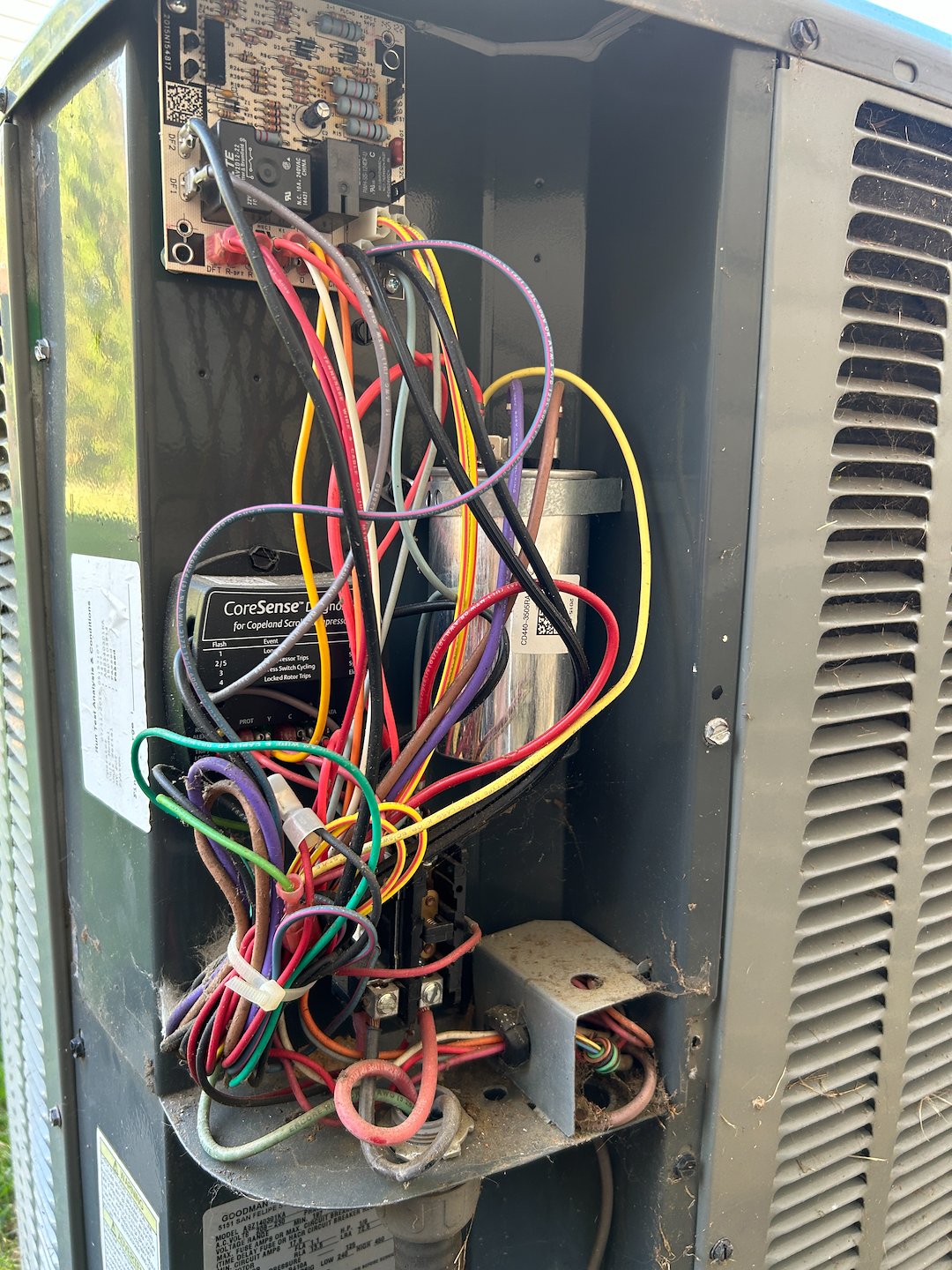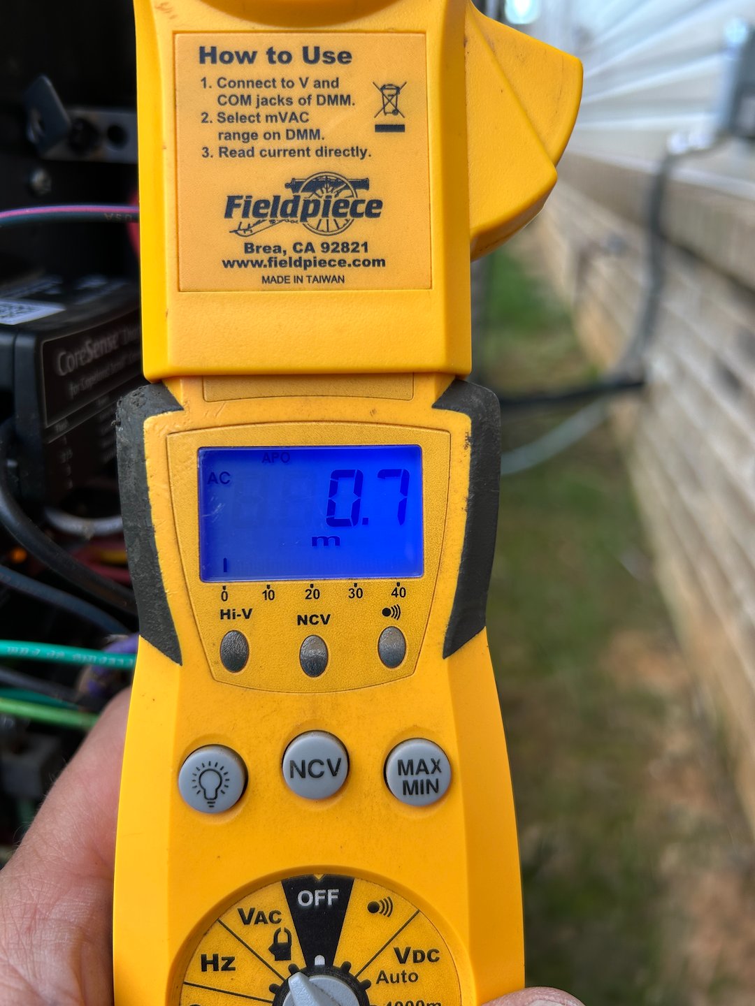 We installed a new Mars USA made dual run capacitor to replace the failed one. We tightened the stake-ons for the wires to confirm that we would have a nice tight connection for each wire. We cleaned the inside of the service panel because it was full of dead bugs and cob webs. We reset the Coresense Diagnostics and restored high voltage to the outdoor unit. We placed our amp clamp on the compressor common wire to measure an inrush amp reading at startup to confirm that we were pulling below the LRA rating on the unit’s data tag.