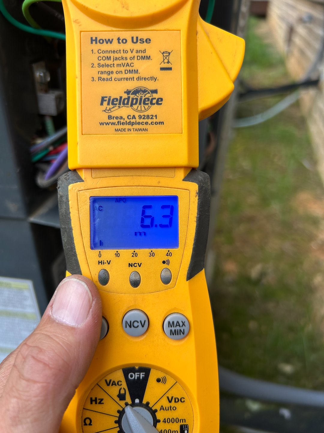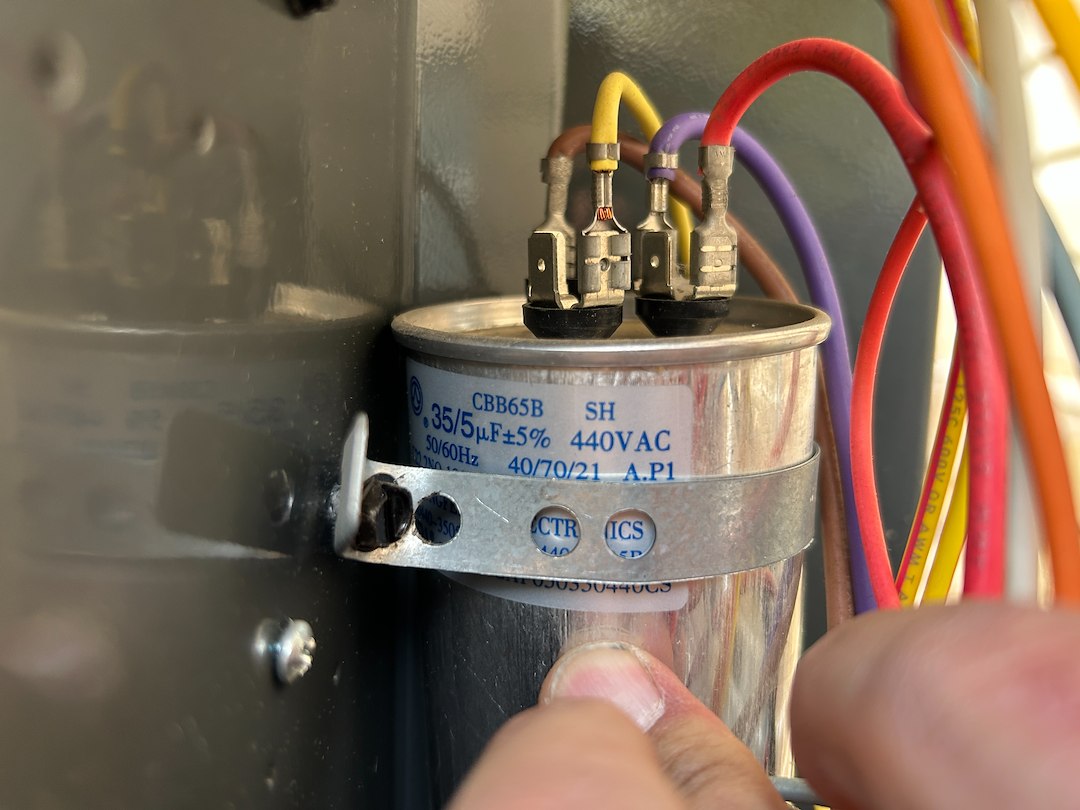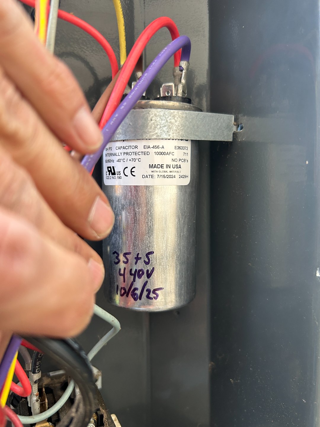 We removed the wires from the dual run capacitor and tested the hermetic side of the capacitor first. We only had 5.4 MFD instead of 35 MFD. The discrepancy in microfarads would definitely cause the machine to draw above the locked rotor amp rating of 72.5 while trying to start. We let the customer know that we found an issue with the heat pump and quoted a price for the repair. The quote was approved and we went to our van to grab the correct sized dual run capacitor.