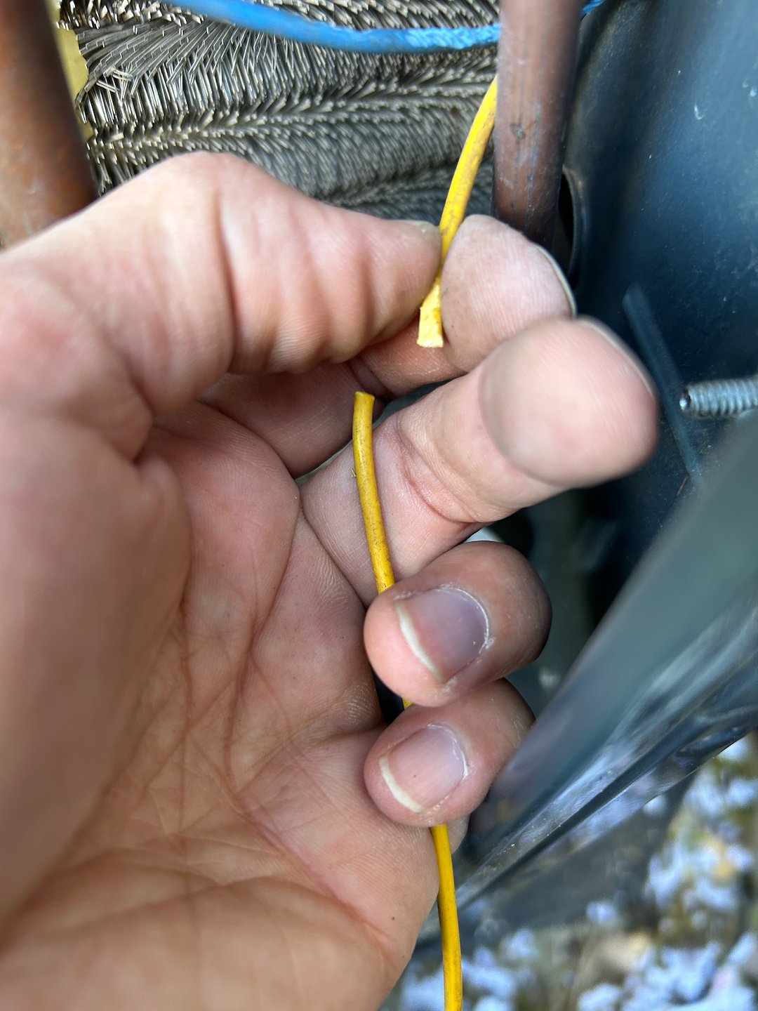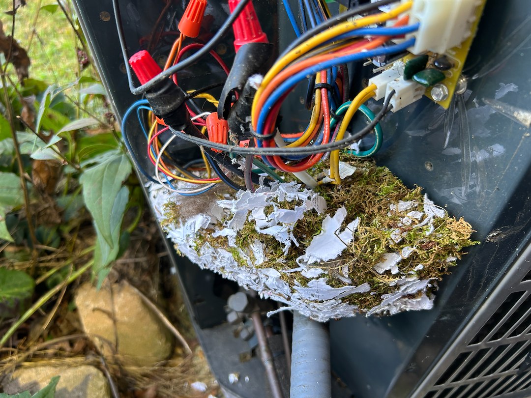 We shut off high voltage to the HVAC system again. We inspected the thermostat wiring leading to the outdoor heat pump and it looked fine. We went to the outdoor heat pump and removed the electrical control panel to the unit and found a massive rodent nest inside the control panel. Luckily, Jimmy the Mouse wasn’t home as we removed his house from inside the control panel and placed it into a trash bag. We inspected the wiring inside the control panel and found multiple wires that had been chewed up or chewed through completely which is what was causing our low voltage shorts to ground. We opened the side panel of the unit and found more wires that were chewed up. We popped the top on the unit and looked at the wiring down inside the machine and it looked like it wasn’t bothered.